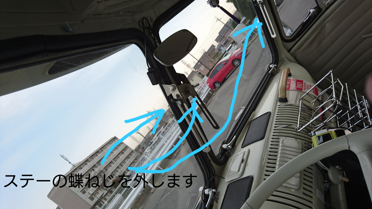 ステーの蝶ねじを全て緩めて外し、次にボディに固定している蝶番のネジを取り外します。
