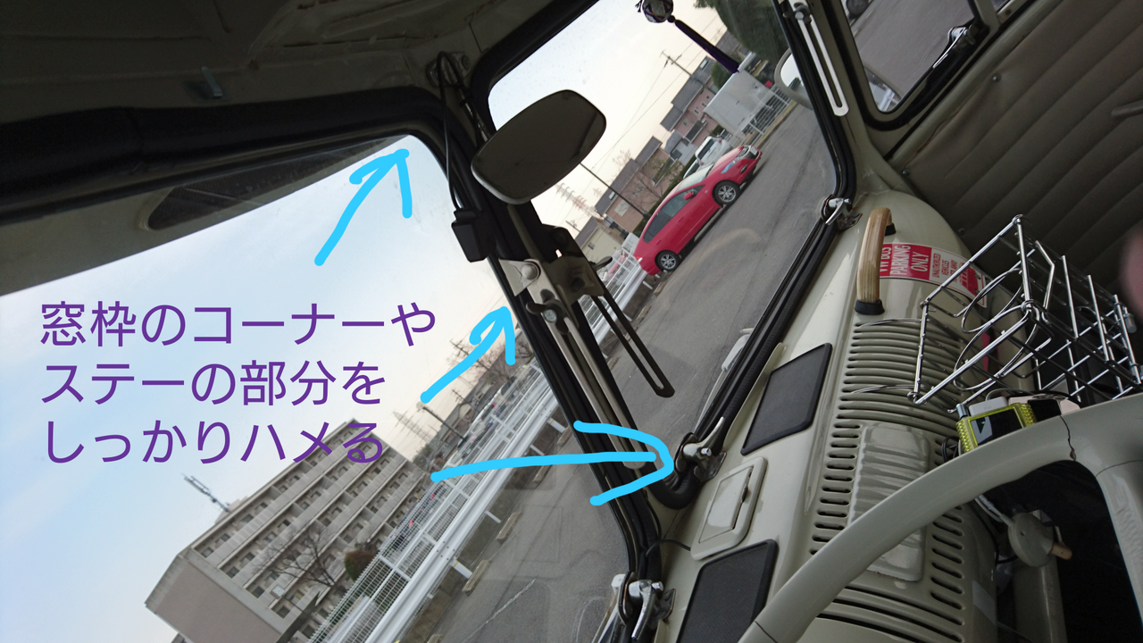 コーキングが乾いたら、サファリを閉めてウインドウシールに癖をつけます。